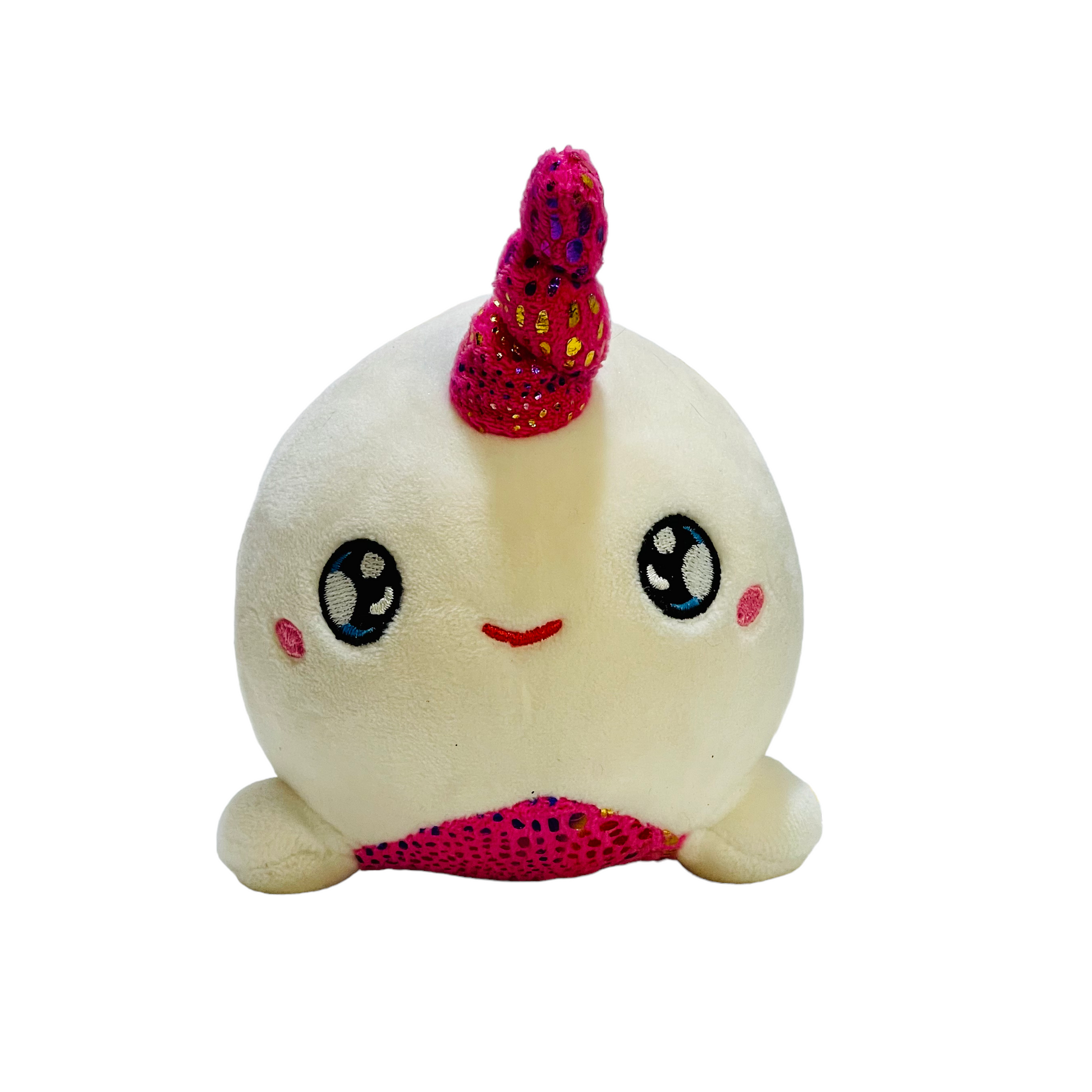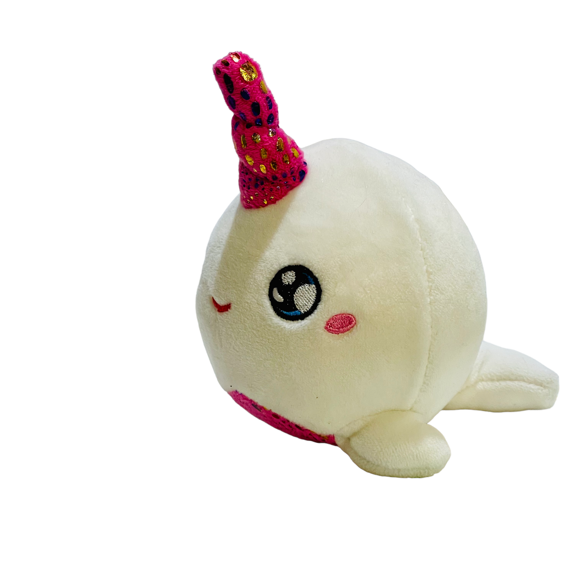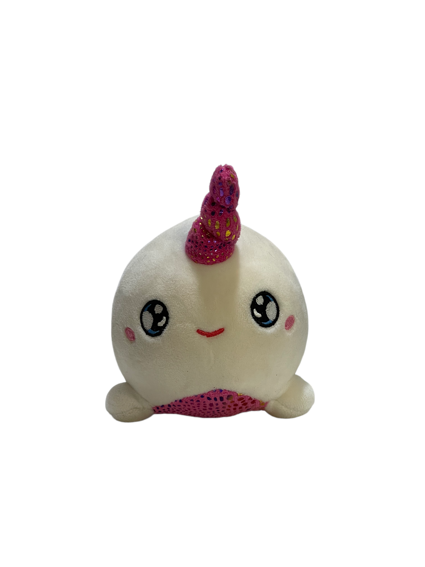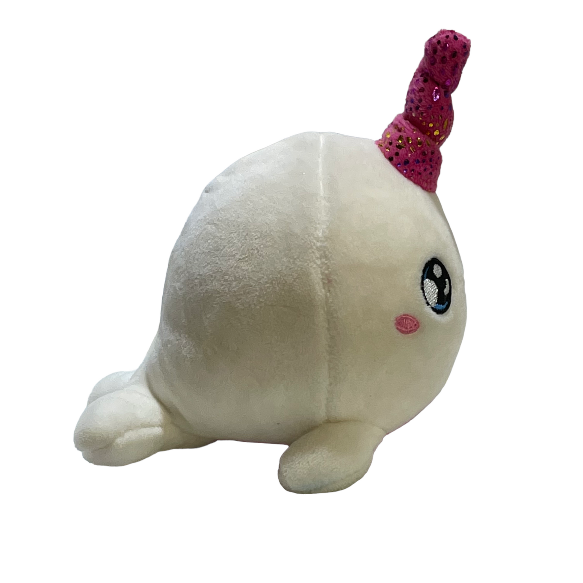 Plush Squishy Narwhal Stress Ball in bright white with sparkly pink tooth and tummy. Sweet Embroidered face, 5.5 " high. Squishy and adorable.