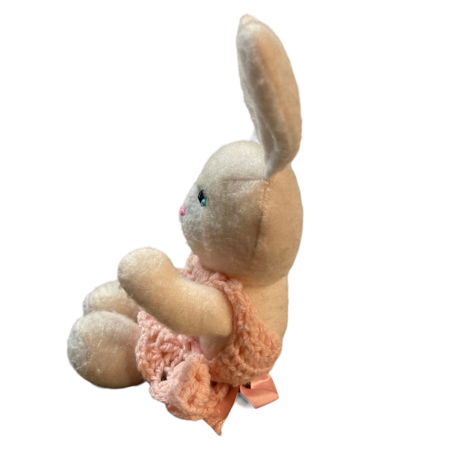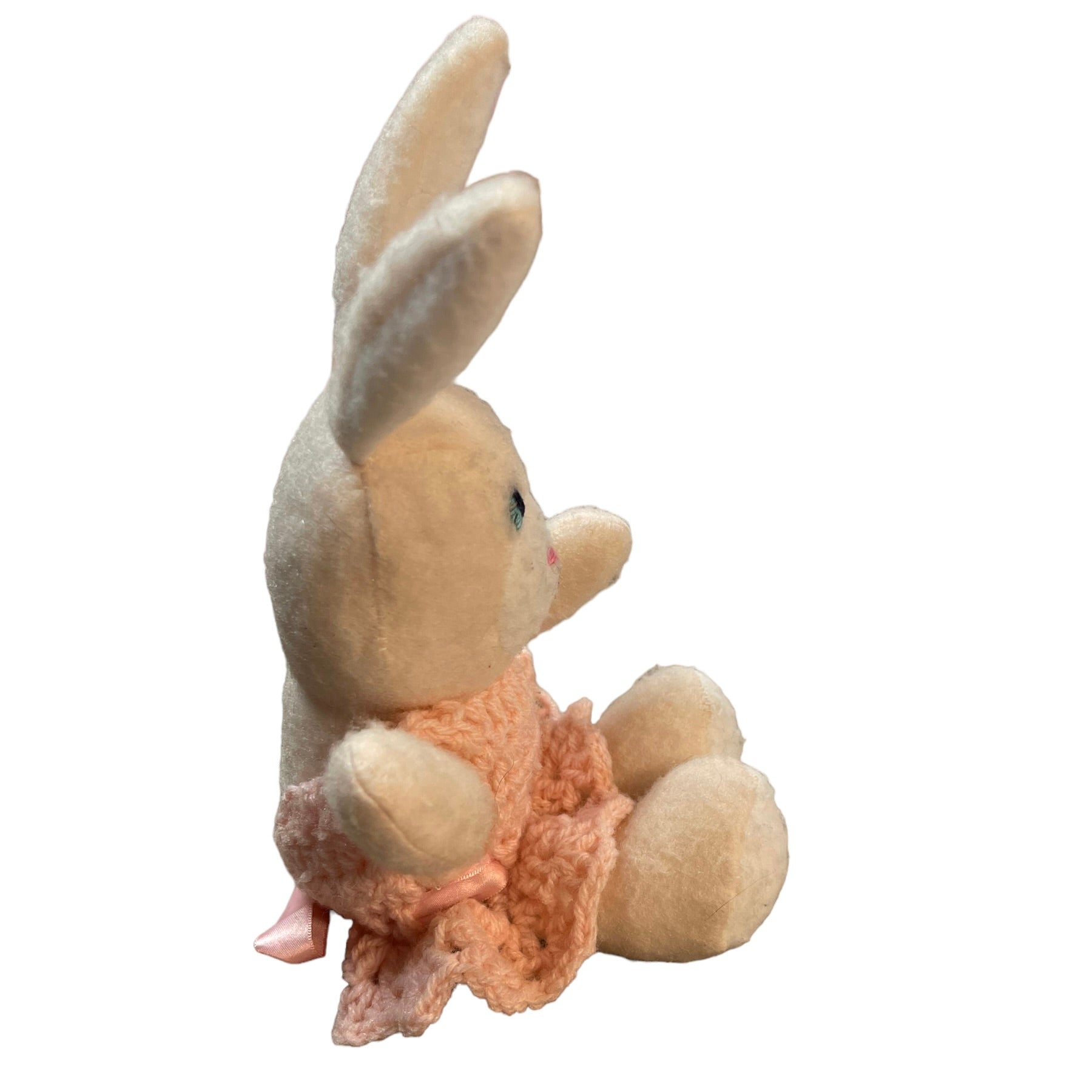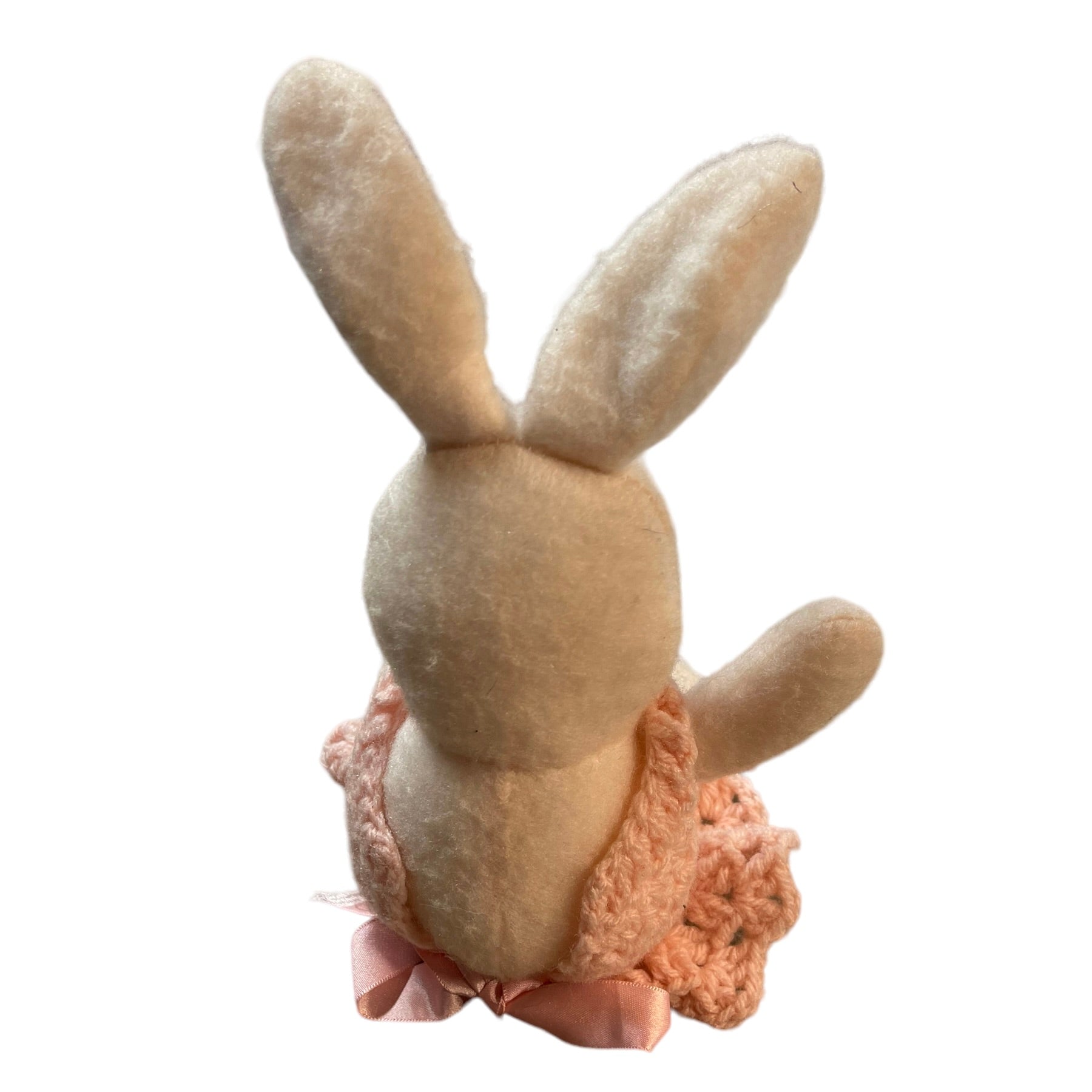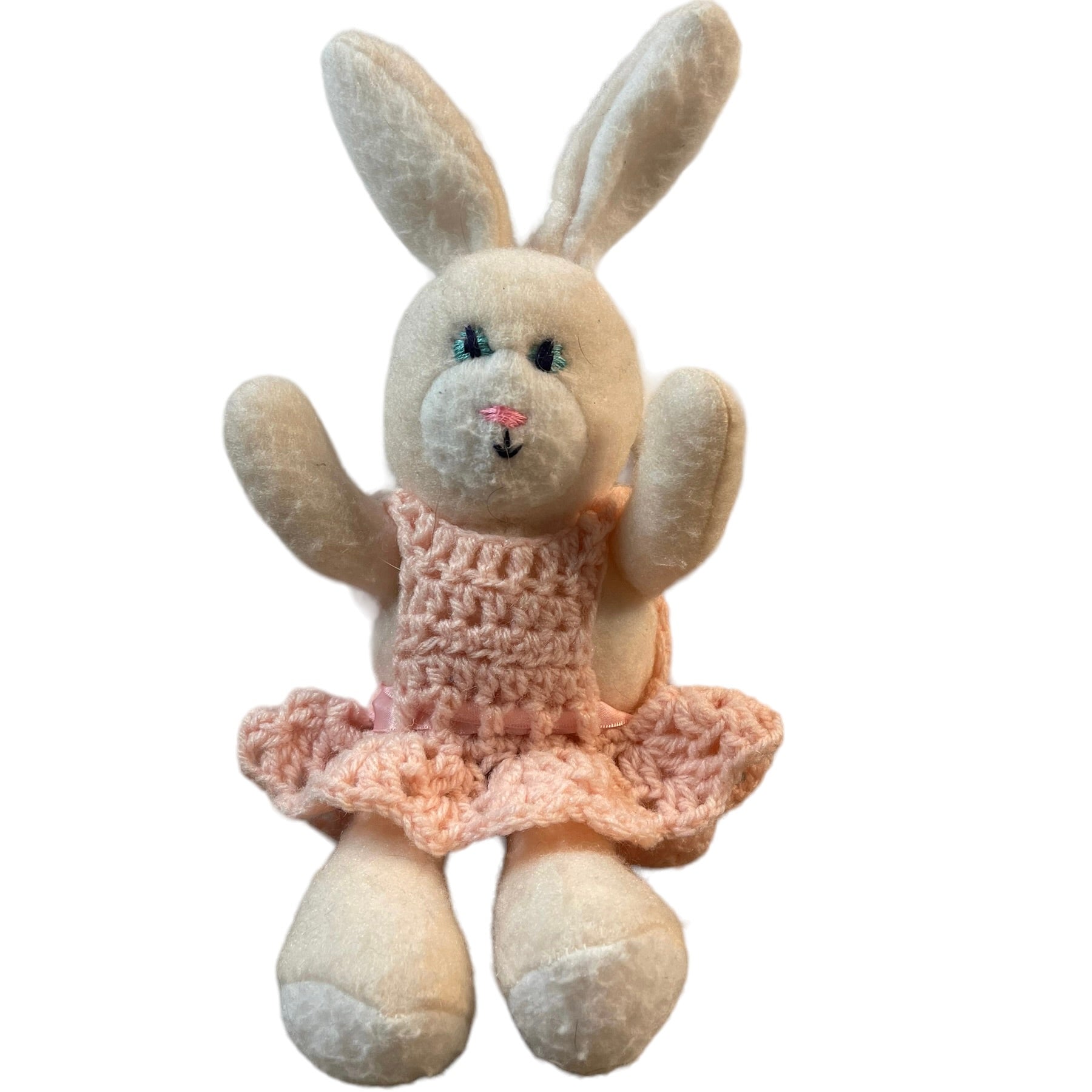 Adorable Unbranded 10" White Easter Bunny with Crocheted Pink Dress with Pink Satin Ribbon. Looks Vintage, but unconfirmed. Would be a charming addition to an Easter Basket.