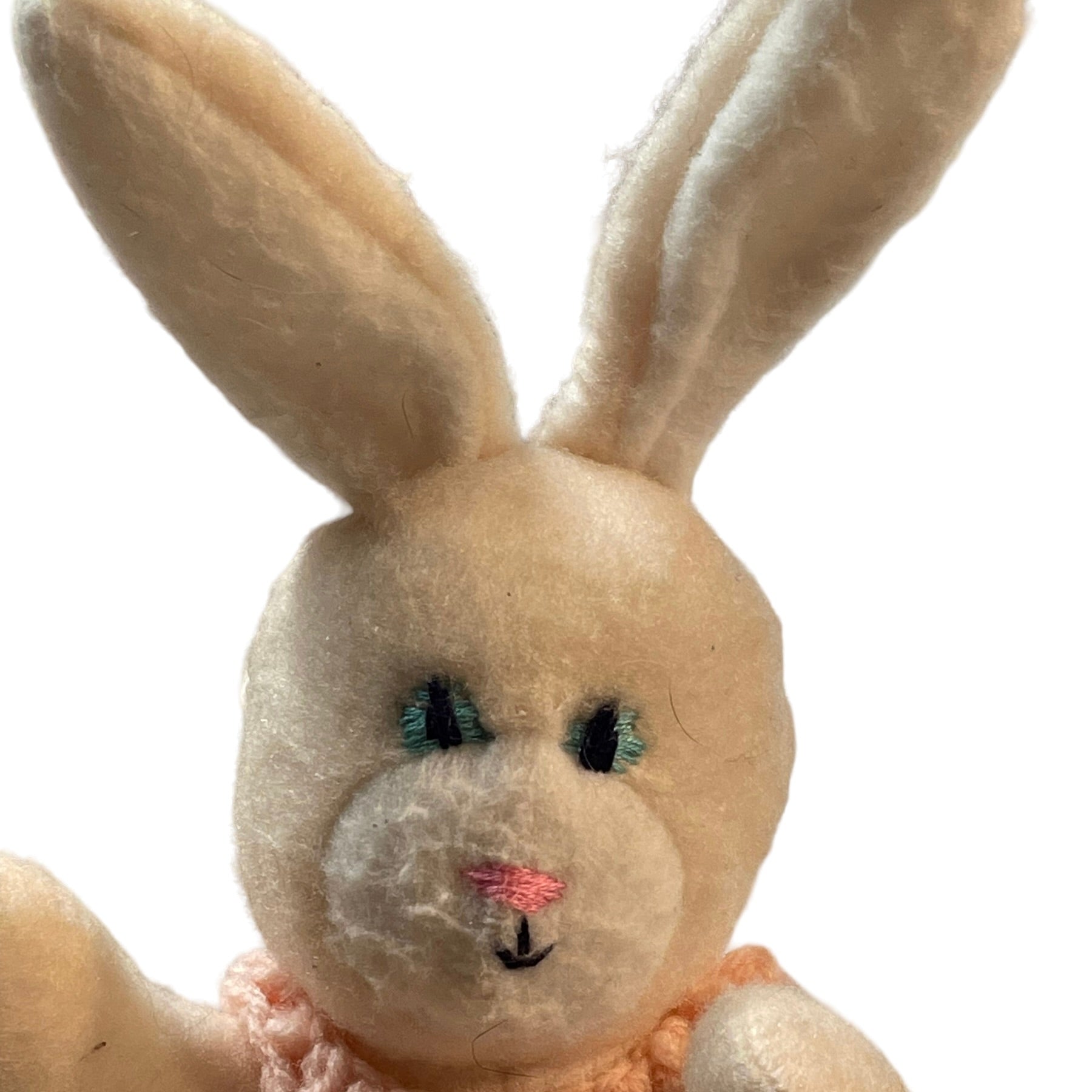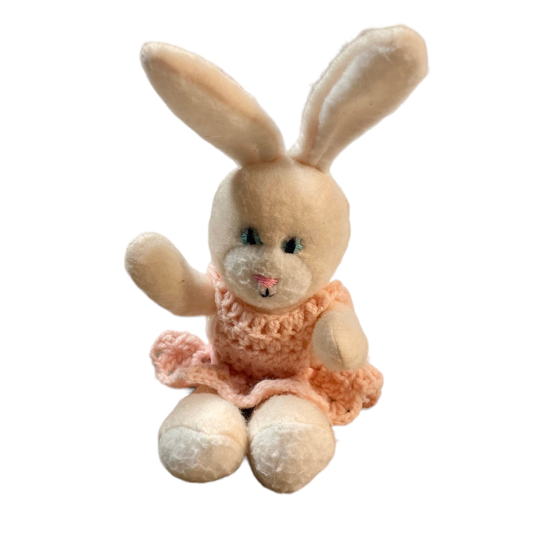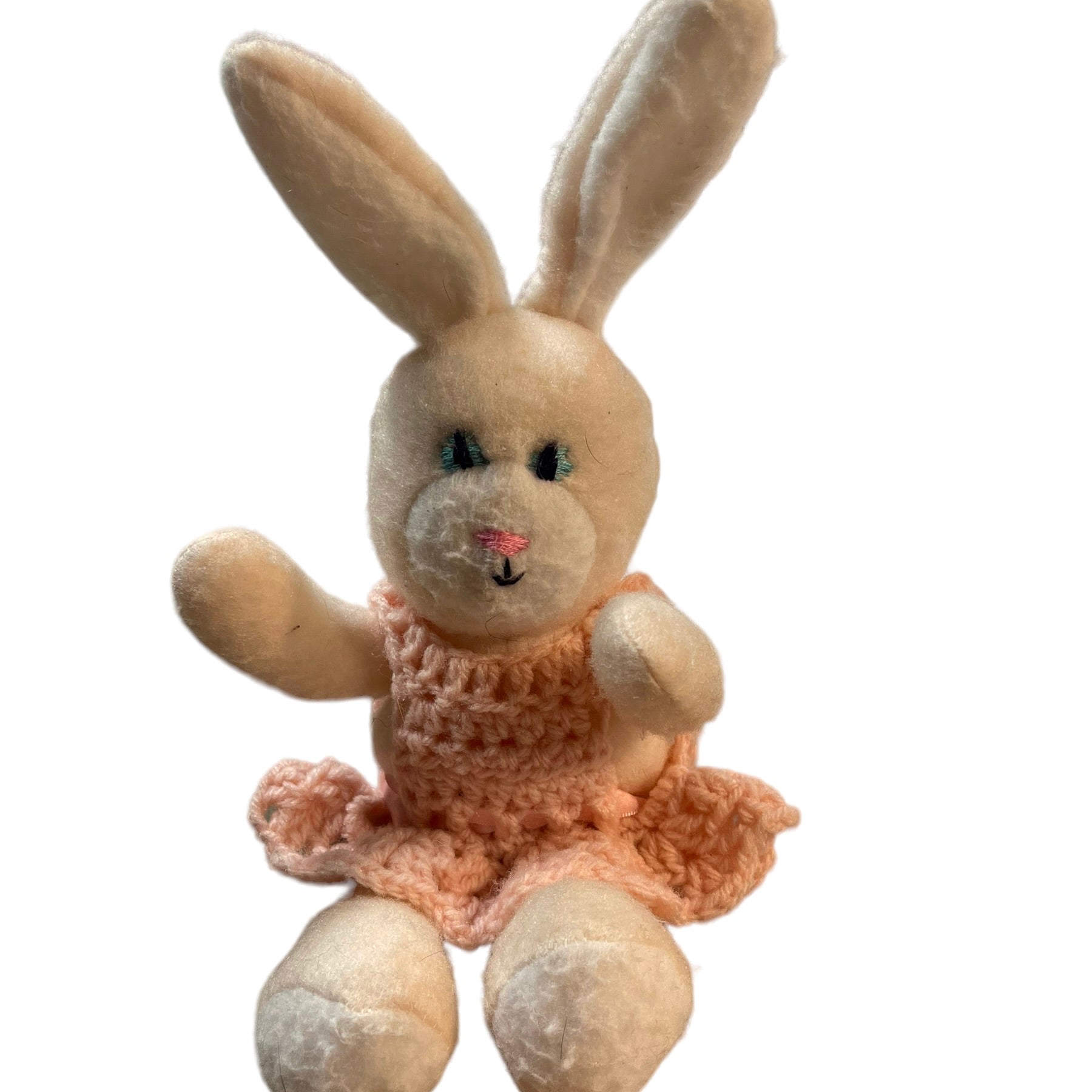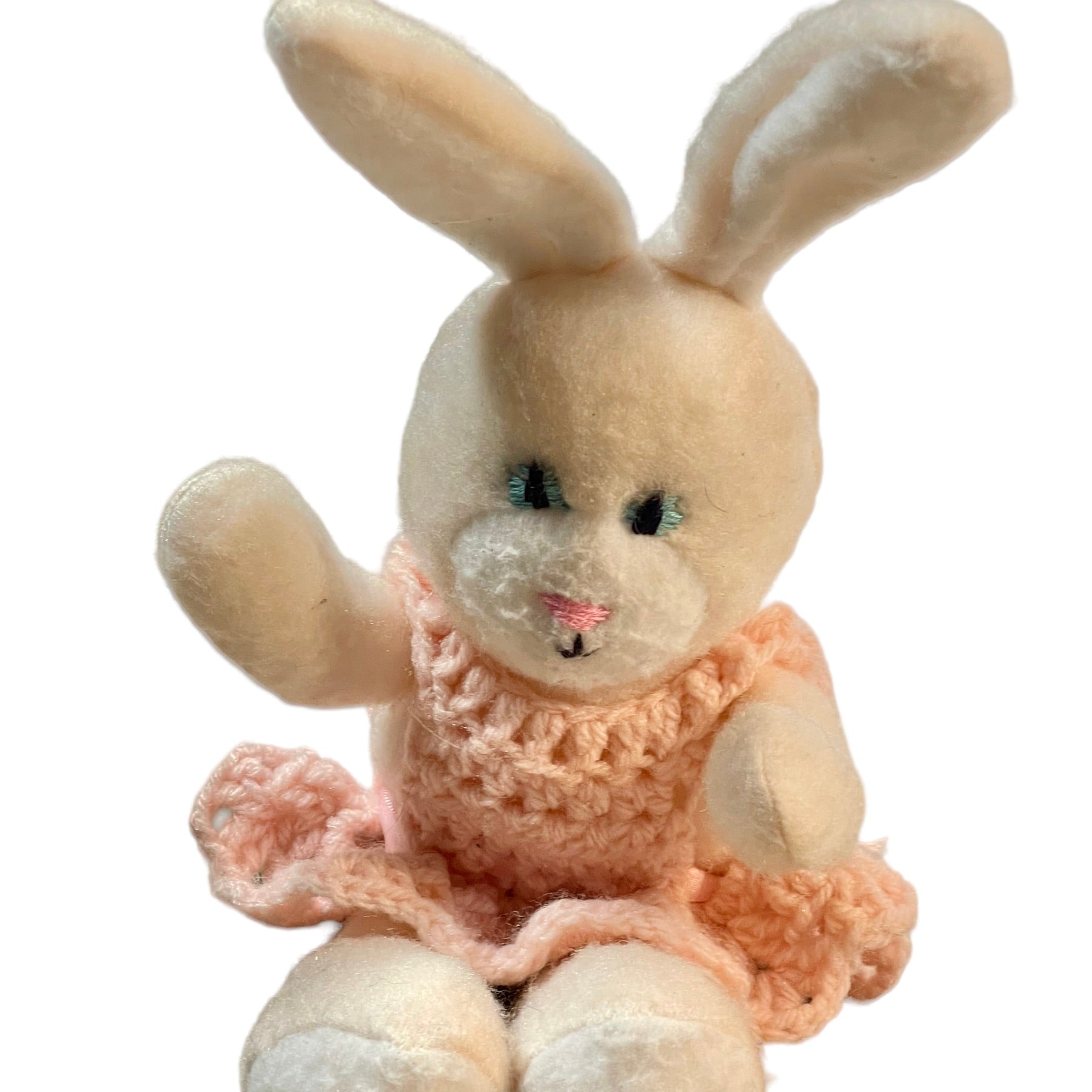 Adorable Unbranded 10" White Easter Bunny with Crocheted Pink Dress with Pink Satin Ribbon. Looks Vintage, but unconfirmed. Would be a charming addition to an Easter Basket.