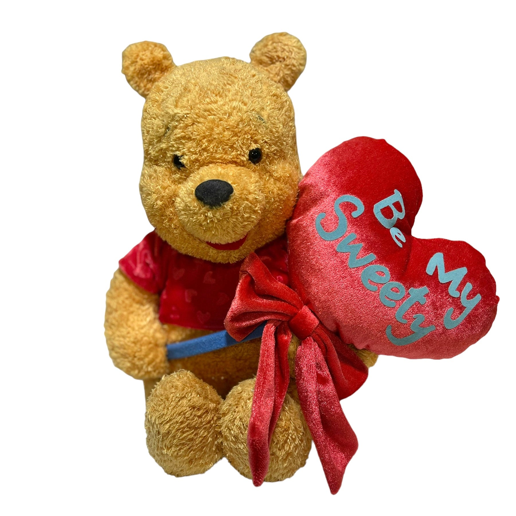 Winnie the Pooh, Plush 'Be My Sweety' Valentine Heart Stuffed Animal with Heart Balloon tied with a big red bow. Winnie's red velvet shirt is with covered with embossed hearts. So sweet! 14"