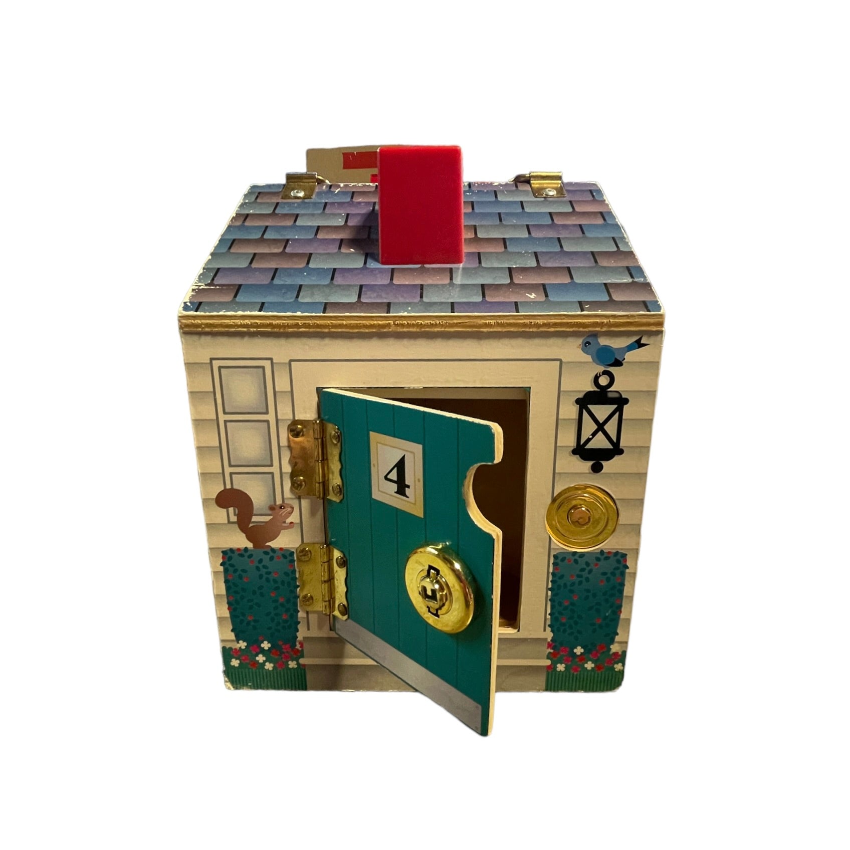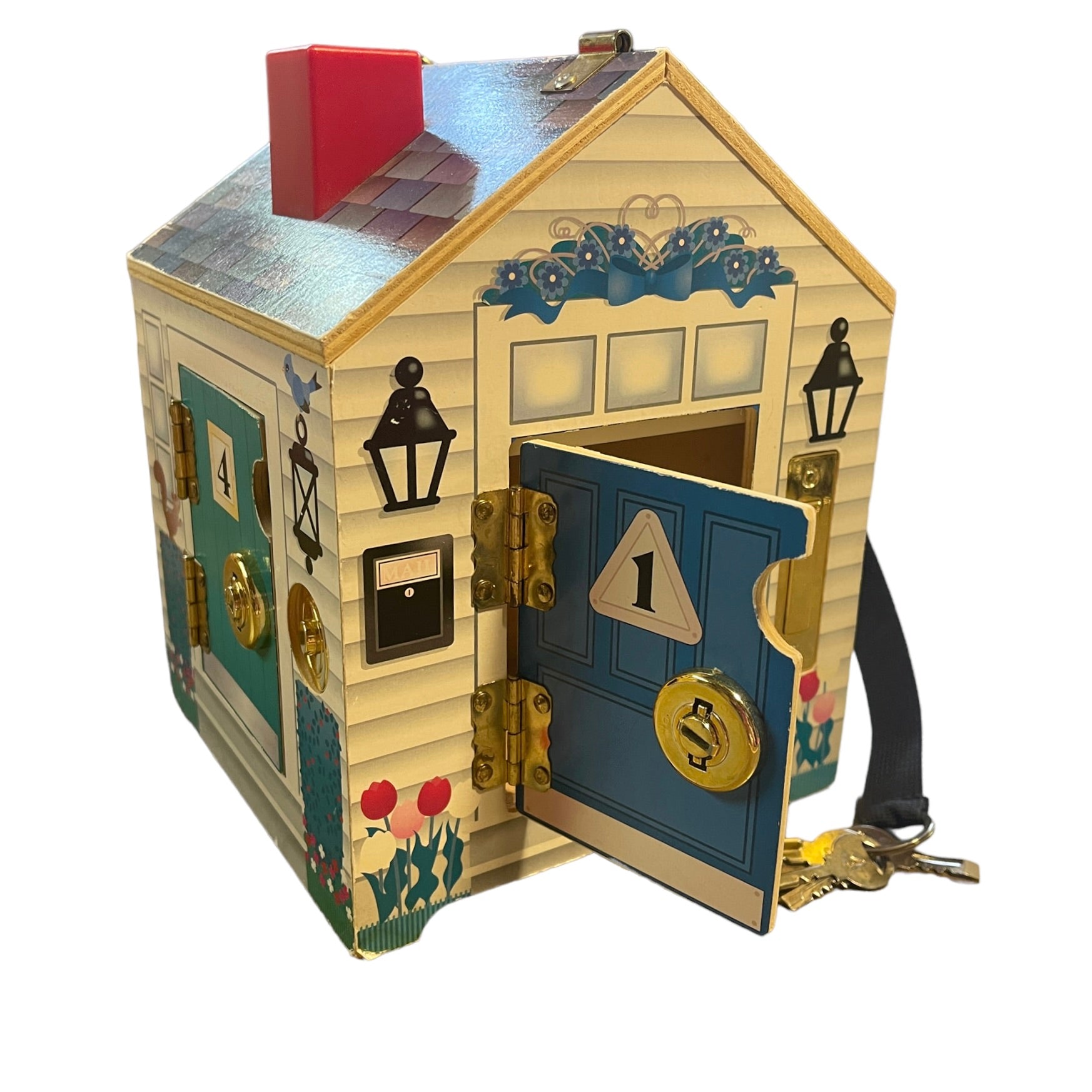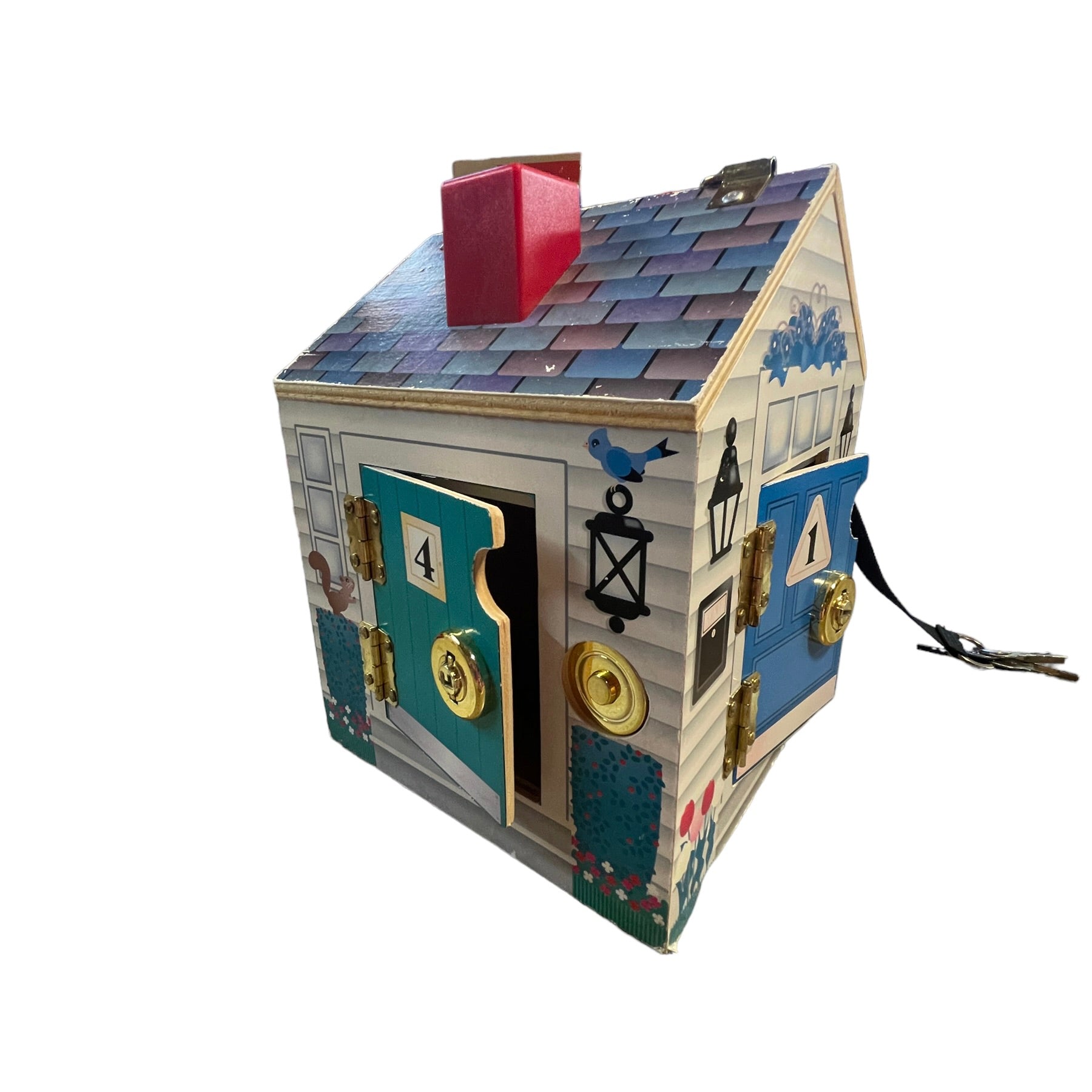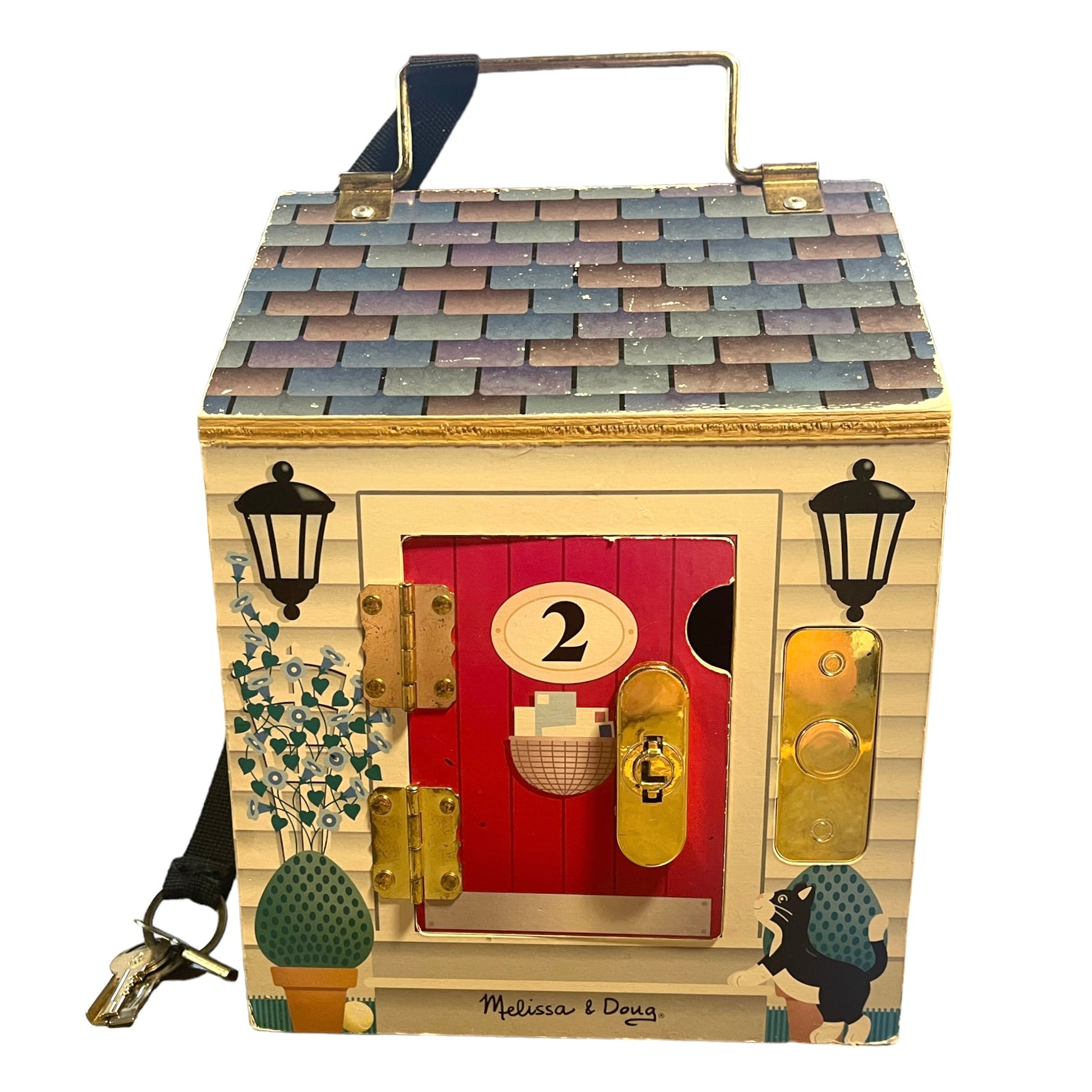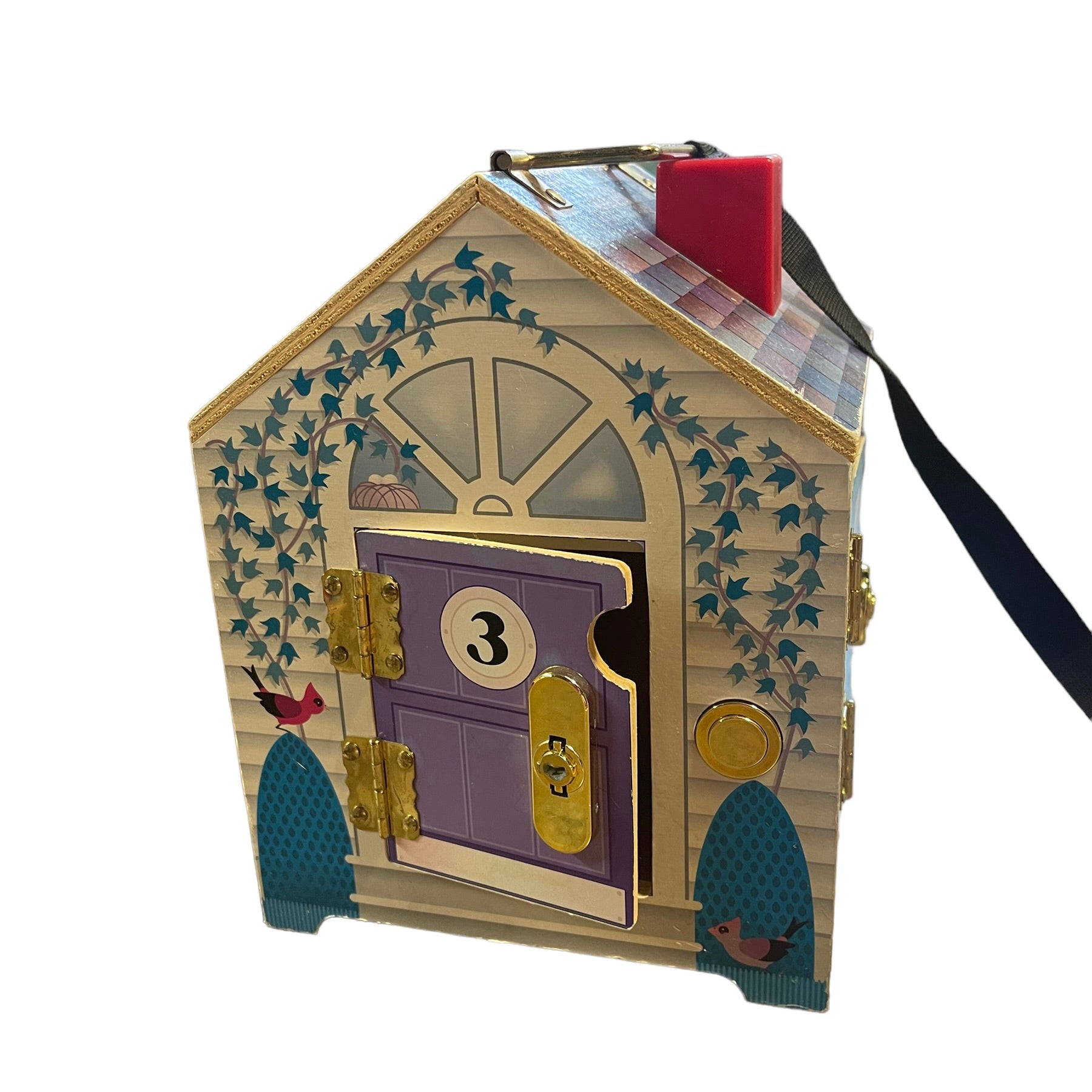 Sturdy Take-a-Long Melissa & Doug Wooden Doorbell House in good played with condition. All locks, keys and doorbells in great condition. Some 'weathering' to the roof and corners of the house. A terrific toy!