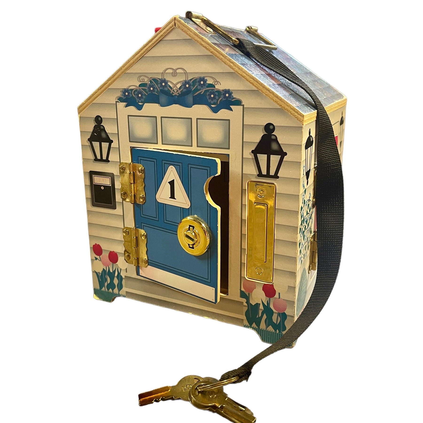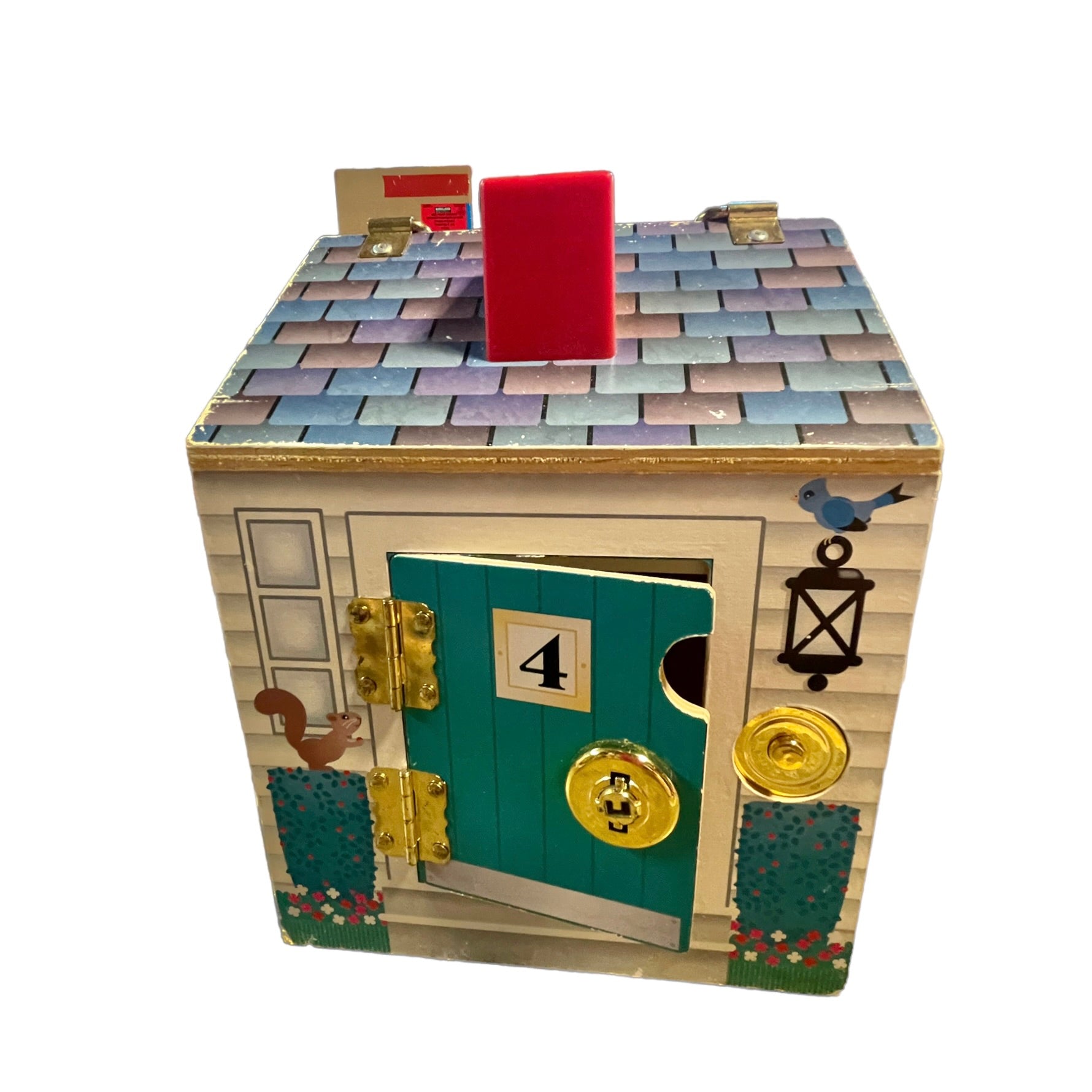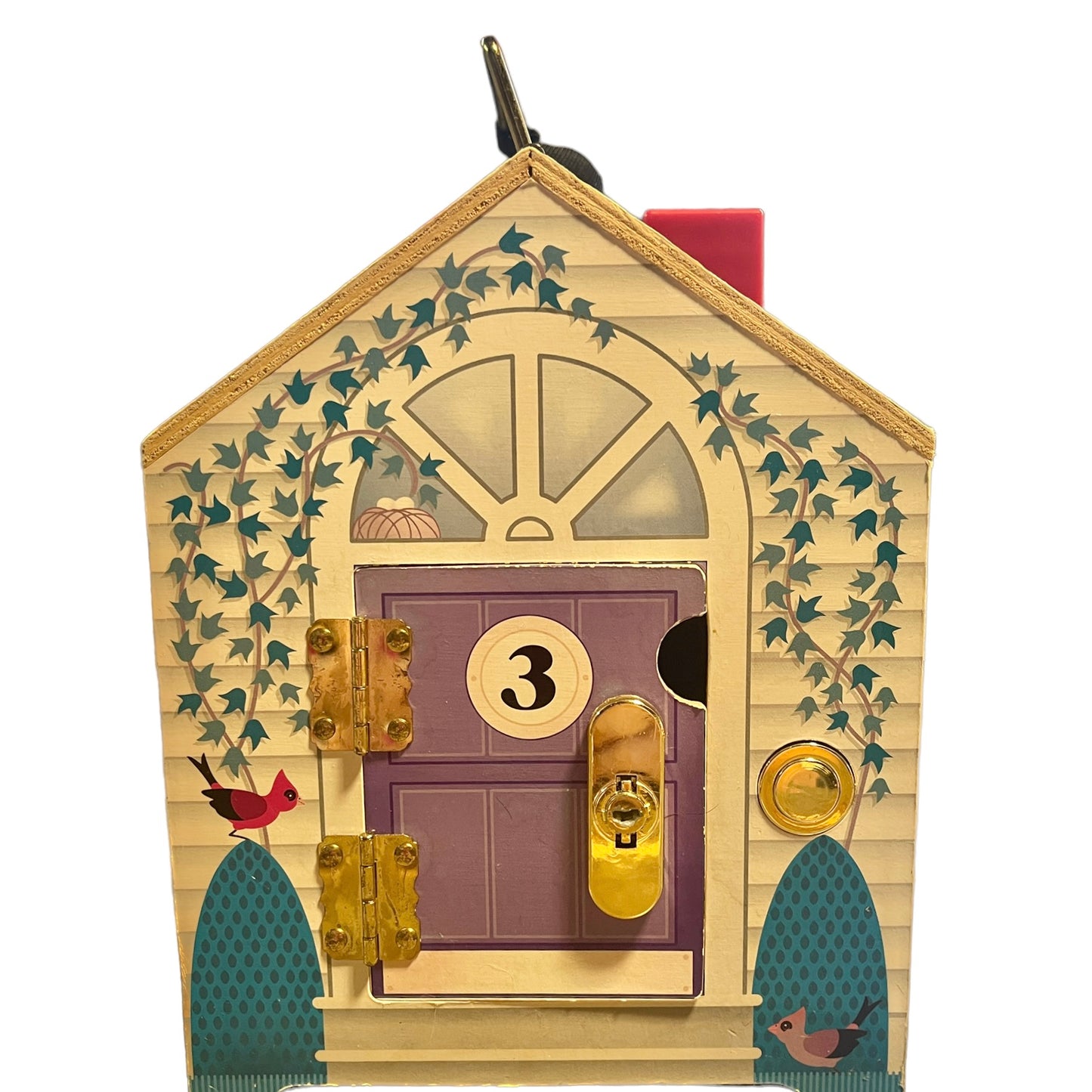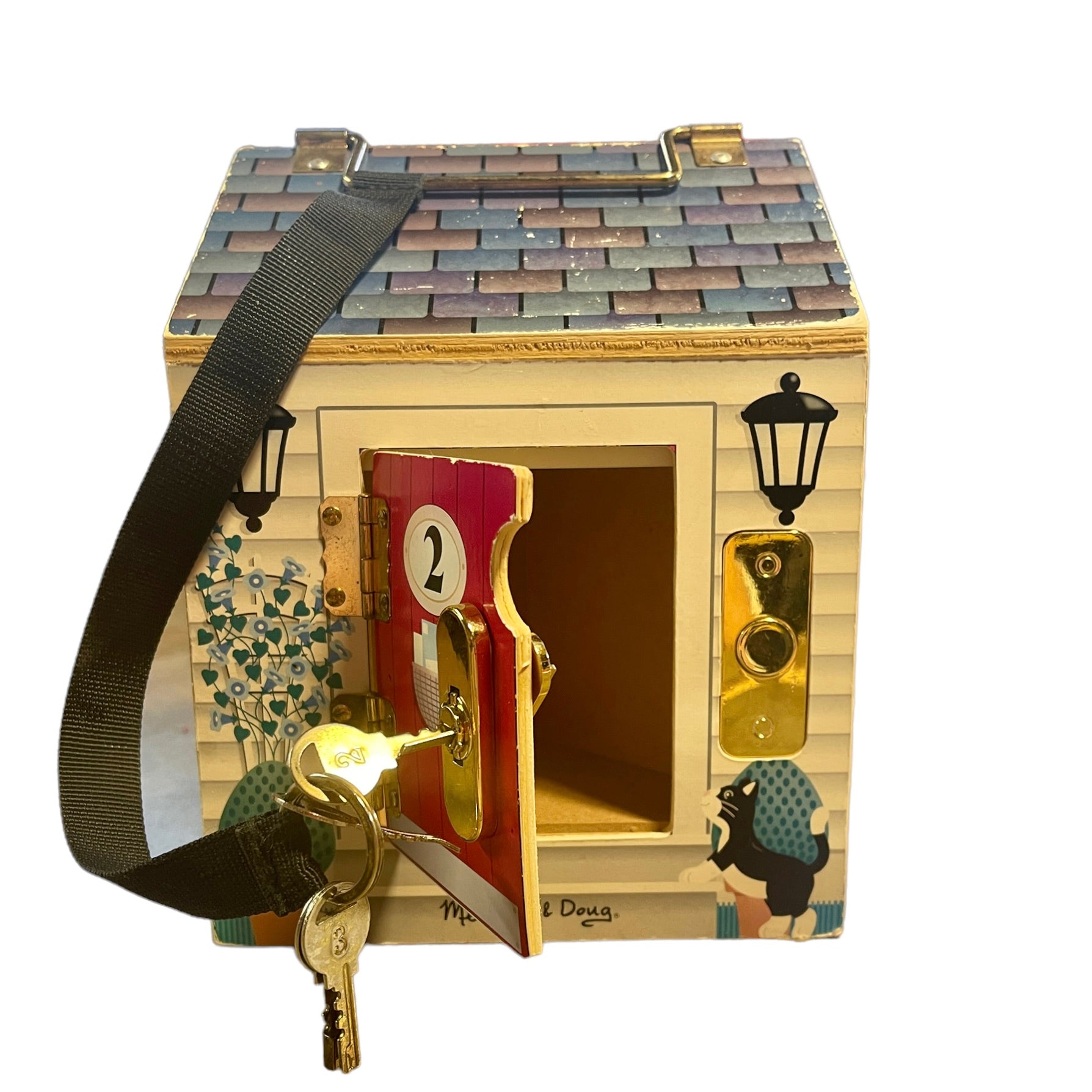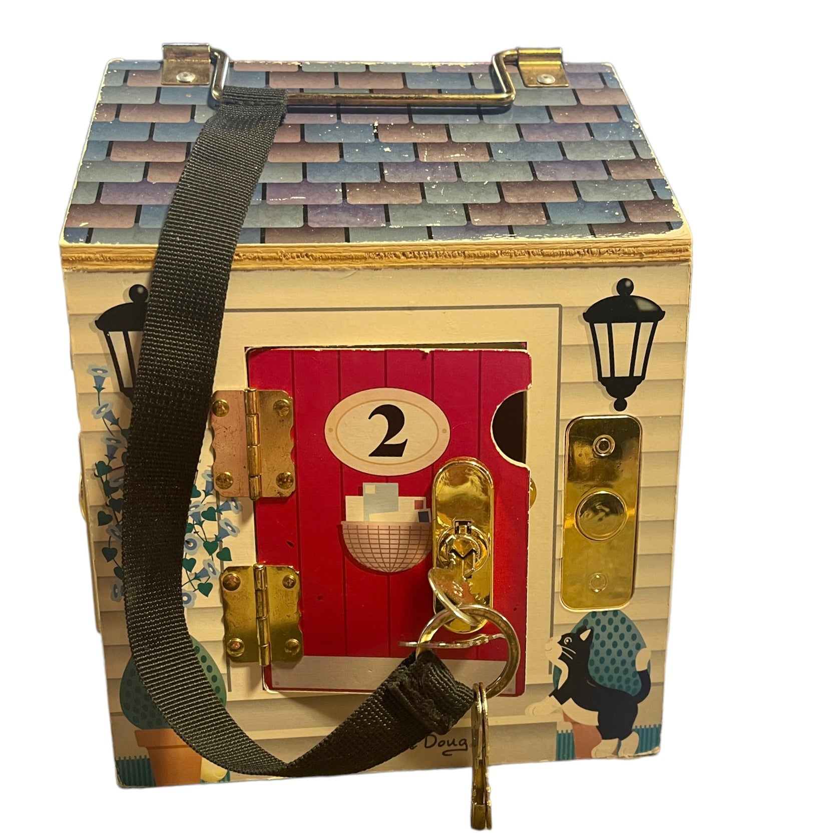 Sturdy Take-a-Long Melissa & Doug Wooden Doorbell House in good played with condition. All locks, keys and doorbells in great condition. Some 'weathering' to the roof and corners of the house. A terrific toy!