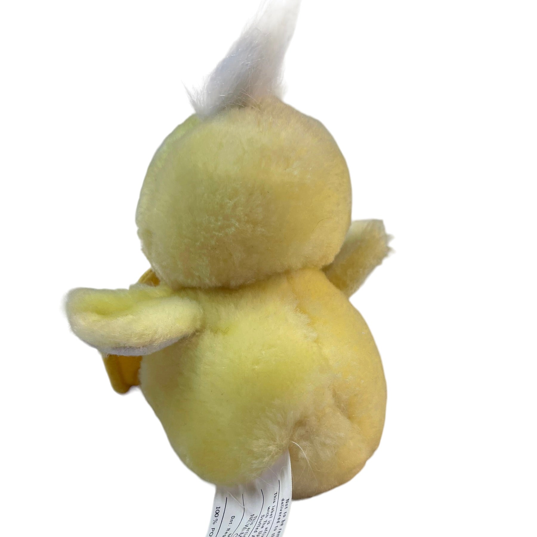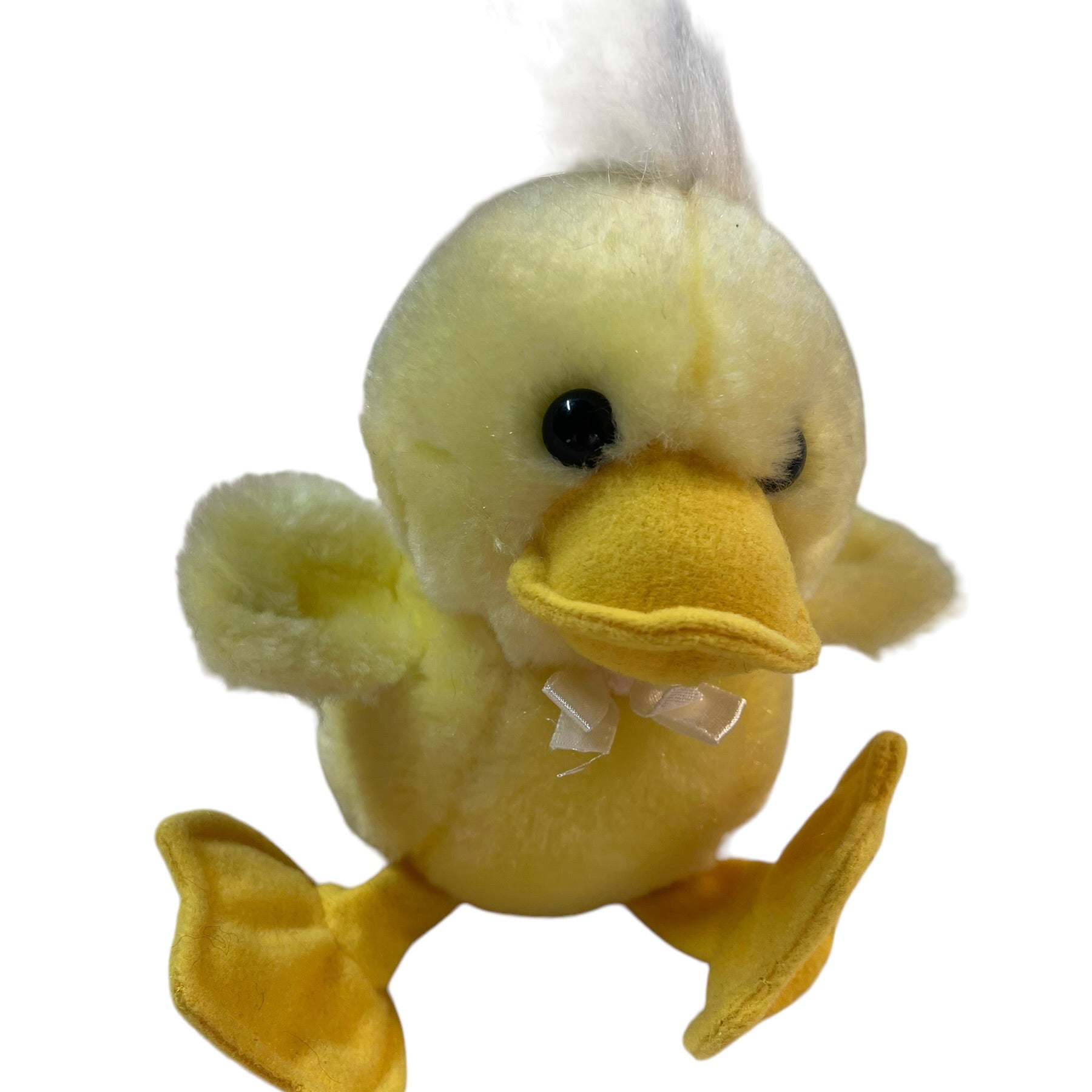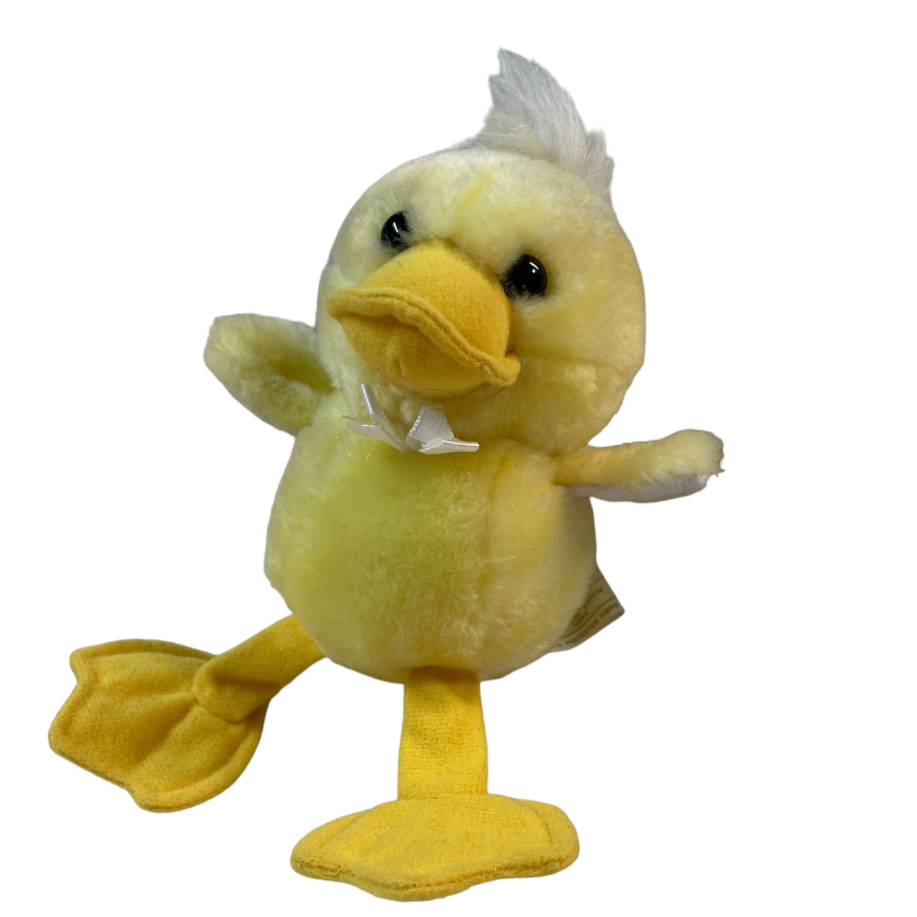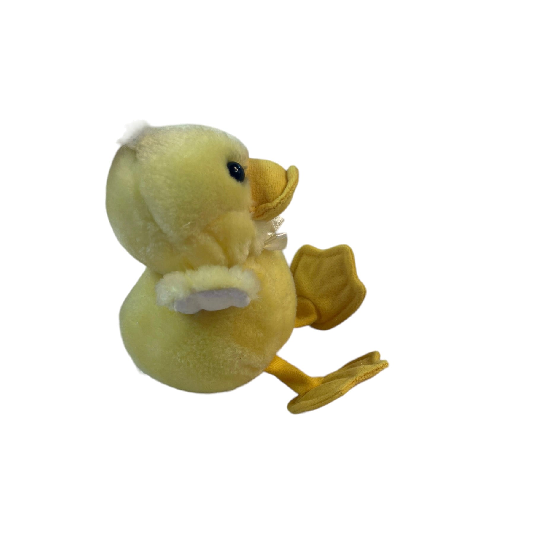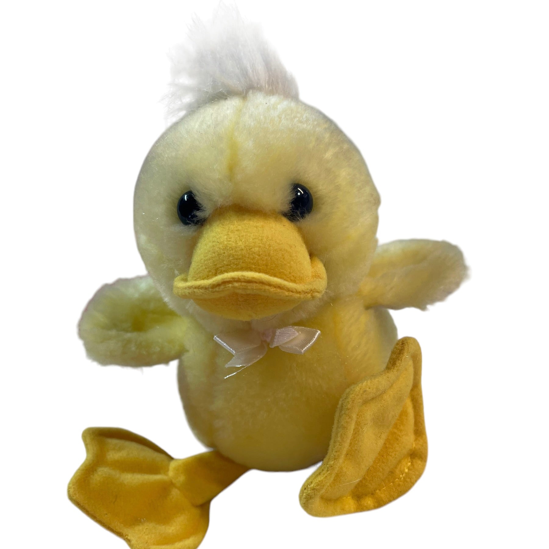 Yellow Duck Plush Rattle 6"Seated, Long Legs, Floppy Feet, Puff of Hair, Satin Bow